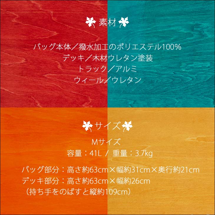■素材: バッグ本体/撥水加工のポリエステル100% デッキ/木材ウレタン塗装 トラック/アルミ ウィール/ウレタン ■カラー: ブラック/メイプル ネイビー/レッド チャコール/ターコイズ カーキ/オレンジ ■サイズ: ・Mサイズ(41L) ・バッグ部分:高さ約63cm×幅約31cm×奥行約21cm ・デッキ部分:高さ約63cm×幅約26cm ・持ち手をのばすと縦約109cm ・容量:41L ・重量:3.7kg ※クレジットカード/銀行振り込み/楽天(etc)決済など、15時までに決済完了の場合は即日発送!(※15時以降の決済確認は翌日以降ご入金確認後の発送) ○デザイン等、予告なしに変更となる場合があります。