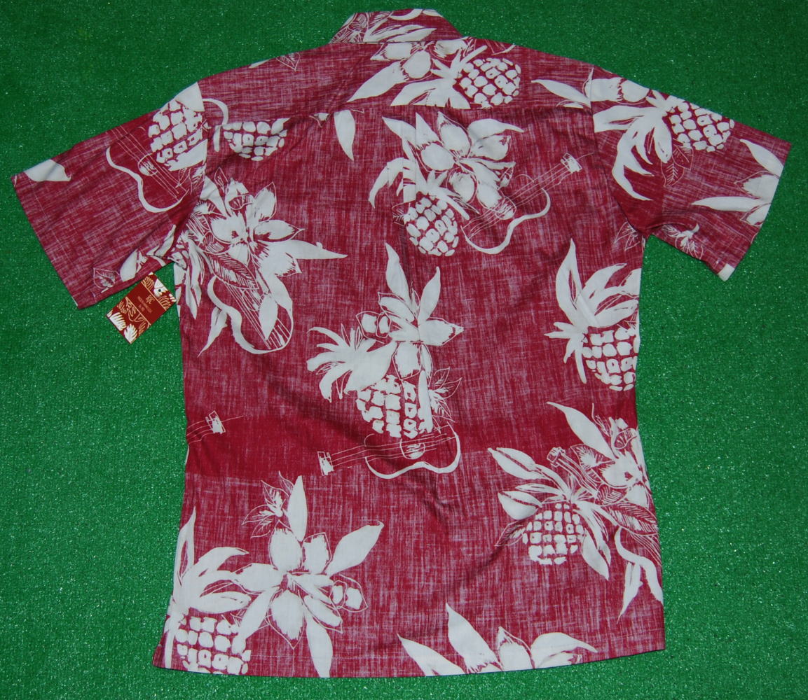 ワイン系軽くプラム混ぜのようなこのカラーリングがまず心を引く一着!やや大き目のハイビスカスとパイアップル、そしてウクレレのモチーフも見事なまでにチープではなくデザイニングしてあるところに好感が持てます!裏地で開襟ではないのもイイね!フォーマルや仕事着にさえOKな上品ささえ漂う! ★